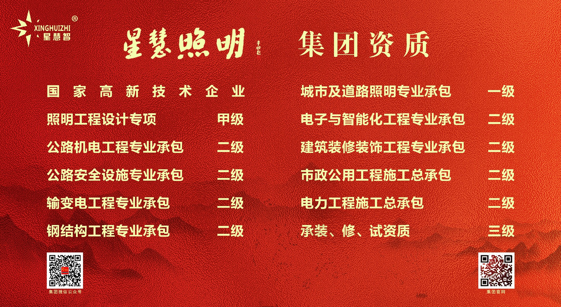 星慧照明工程集團有限公司坐落在中國路燈制造基地:江蘇省高郵市送橋鎮工業集中區。公司成立于1999年,注冊資金5058萬元,廠區占地8萬多平方米,建筑面積6.5萬多平方米,主要下轄三大功能生產廠區和兩處商務運營中心及集團行政總部,是一家集科研、設計、生產、銷售、施工服務為一體的大型戶外照明產品制造商和集成運營商。星慧照明工程集團資質實力雄厚,目前擁有“城市及道路照明專業承包一級資質”、“照明工程設計專項甲級資質”、“電子與智能化工程專業承包二級資質”、“公路安全設施專業承包二級資質”、“公路機電工程專業分項承包二級資質”、“建筑裝修裝飾工程專業承包二級資質”、“市政公用工程施工總承包二級資質”、“鋼結構工程專業承包二級資質”、“電力工程施工總承包二級資質”、“輸變電工程專業承包二級資質”、“承裝(修、試)”三級資質。公司榮幸被評為省重合同守信用企業、省質量信得過企業、AAA級資信企業,并成功通過ISO9001:2015質量體系認證、ISO14001:2015環境體系認證、“CE”認證及“CCC”及“CQC”國家強制性產品認證、中國節能產品認證。公司成立江蘇省研究生工作站,并先后榮獲江蘇省名牌產品、省著名商標、高郵市市長質量獎、揚州市百強民營企業等榮譽證書,被江蘇省認定為企業技術中心,并順利通過安全生產標準化二級企業驗收并取得證書,為企業的跨越性發展打下健康穩健的基礎!集團公司的產品主要包括:智慧路燈、道